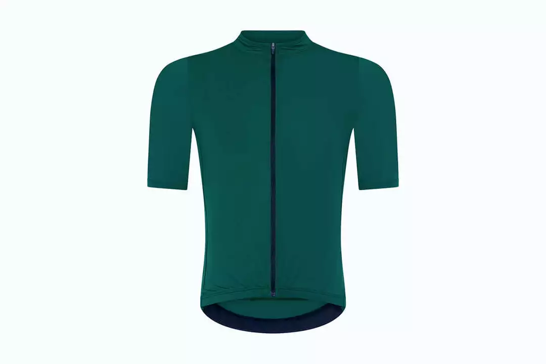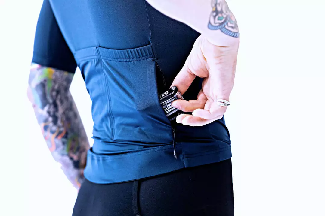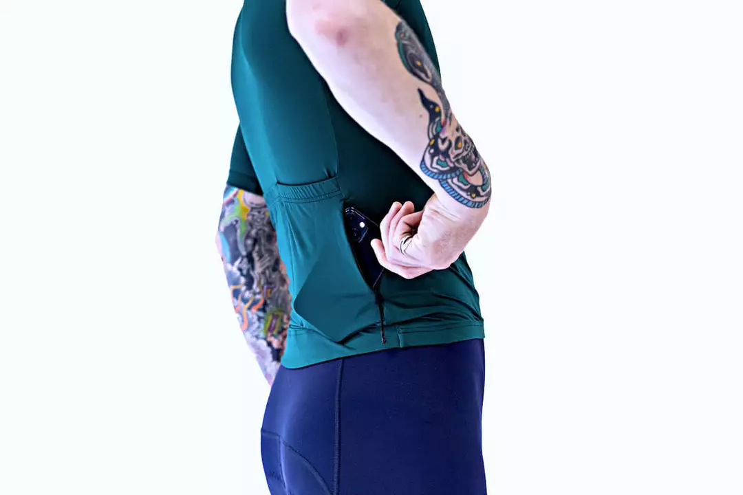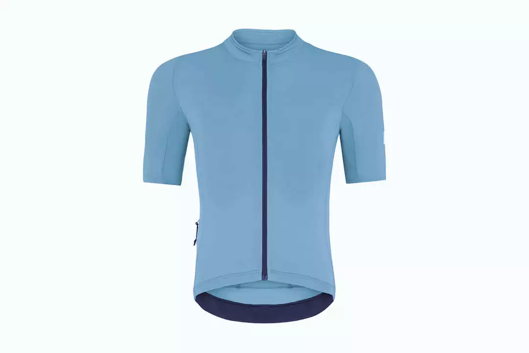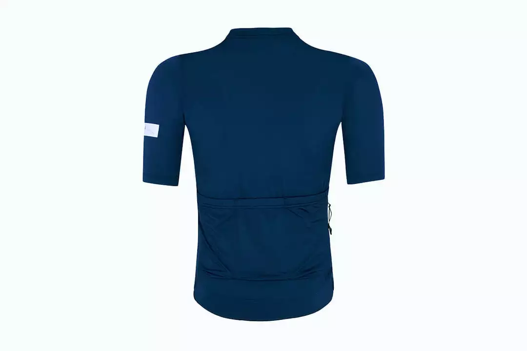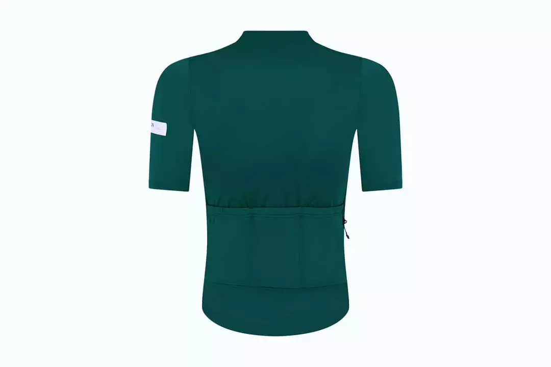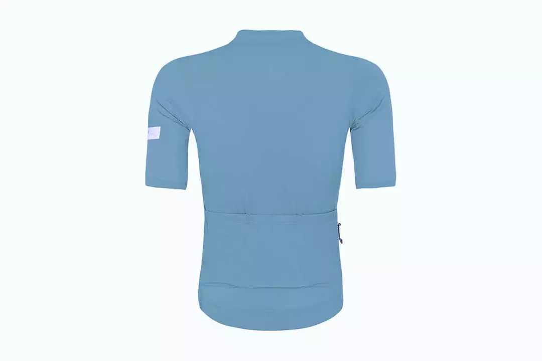 Lightweight short sleeve cycling jersey made using a high stretch, breathable, moisture wicking fabric for riding in warm weather conditions.