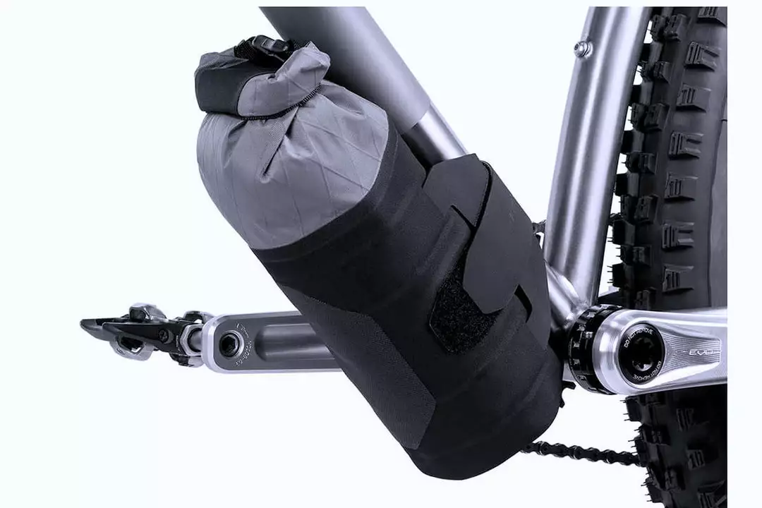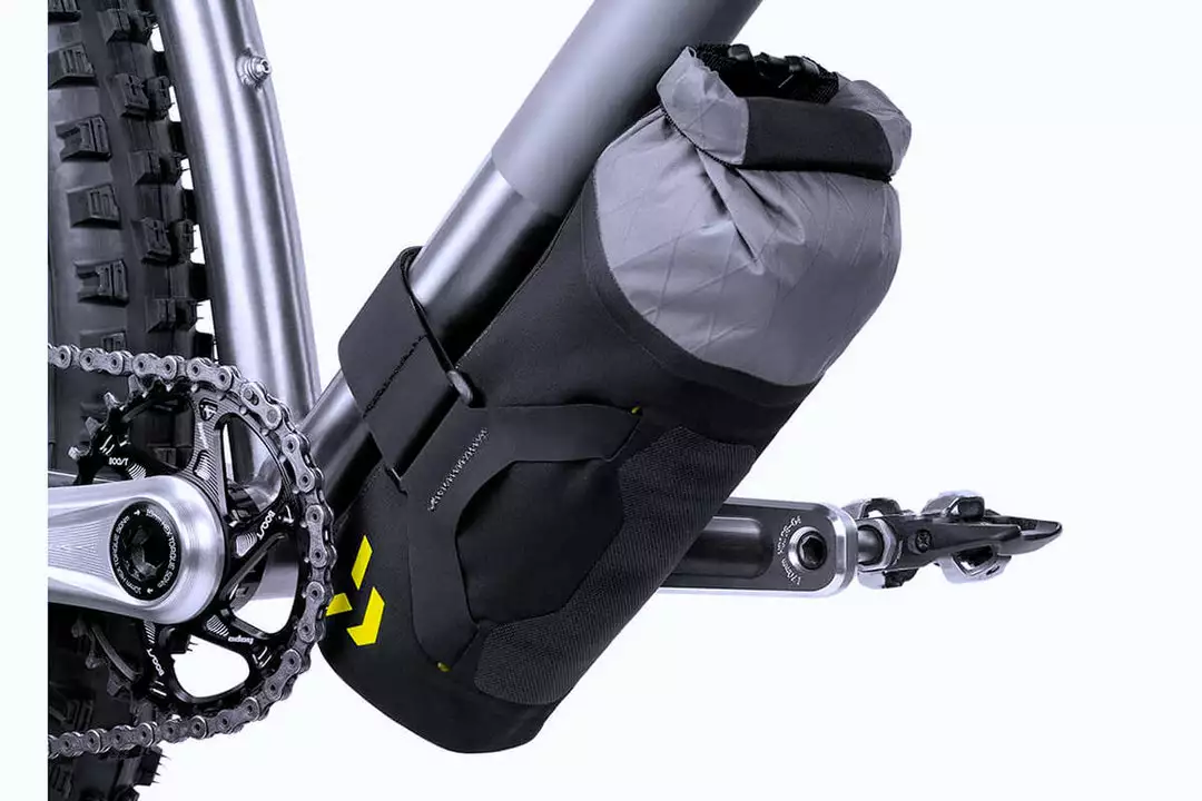 The Backcountry Downtube Pack securely fastens to the downtube and similar diameter tubes to provide a versatile and compressible storage space for spares and long-distance essentials. It has enough capacity for a 1L water bottle, allowing it to be used as a bottle holder bag for bikes with limited bottle storage space within the main triangle.