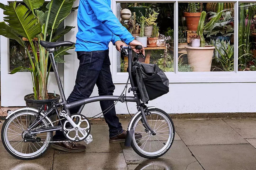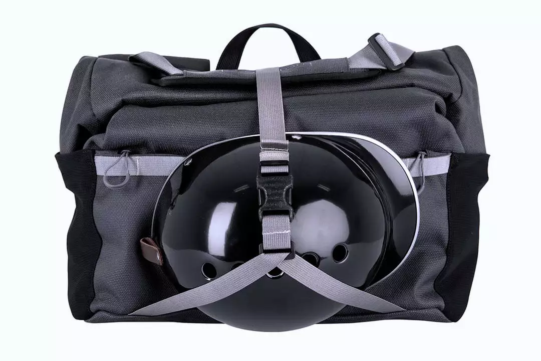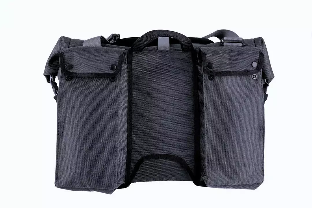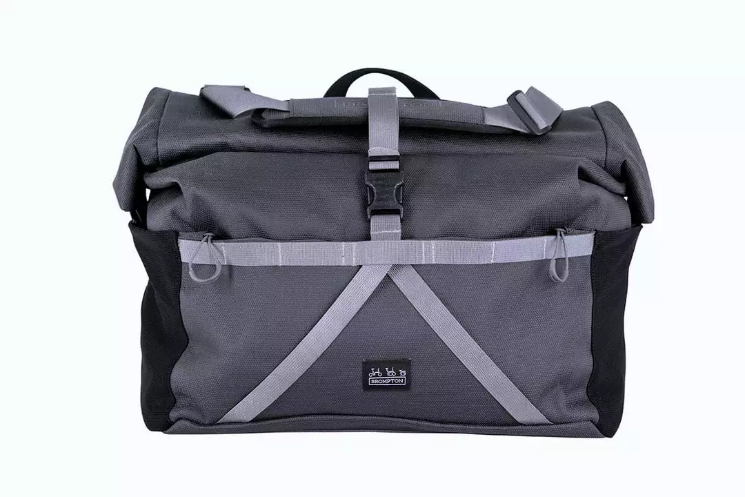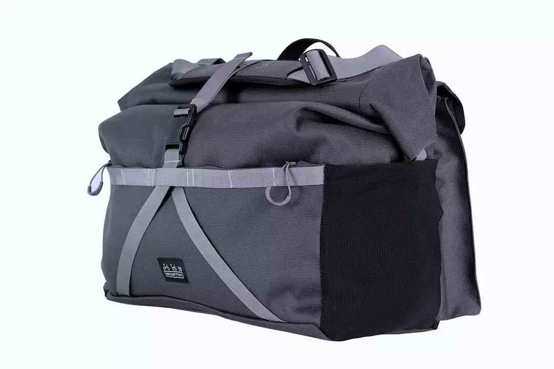 A fresh take on the T Bag, the Borough L Roll Top is made using Brompton’s exclusively developed 1000D Cordura Broken Twill fabric for superior durability and weather resistance. New features include an adjustable external load carry strap for easy access to helmets, jackets, or oversized items. There is large zipped pocket on the front for quick access to essential items, re-designed rear pockets with an integral water bottle sleeve, and a laptop sleeve.
