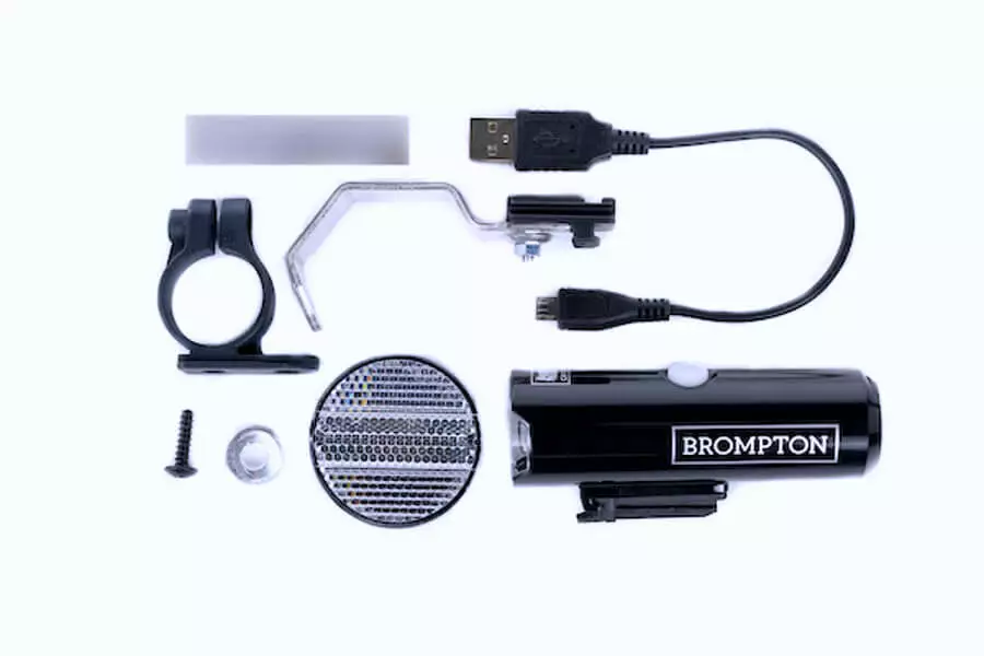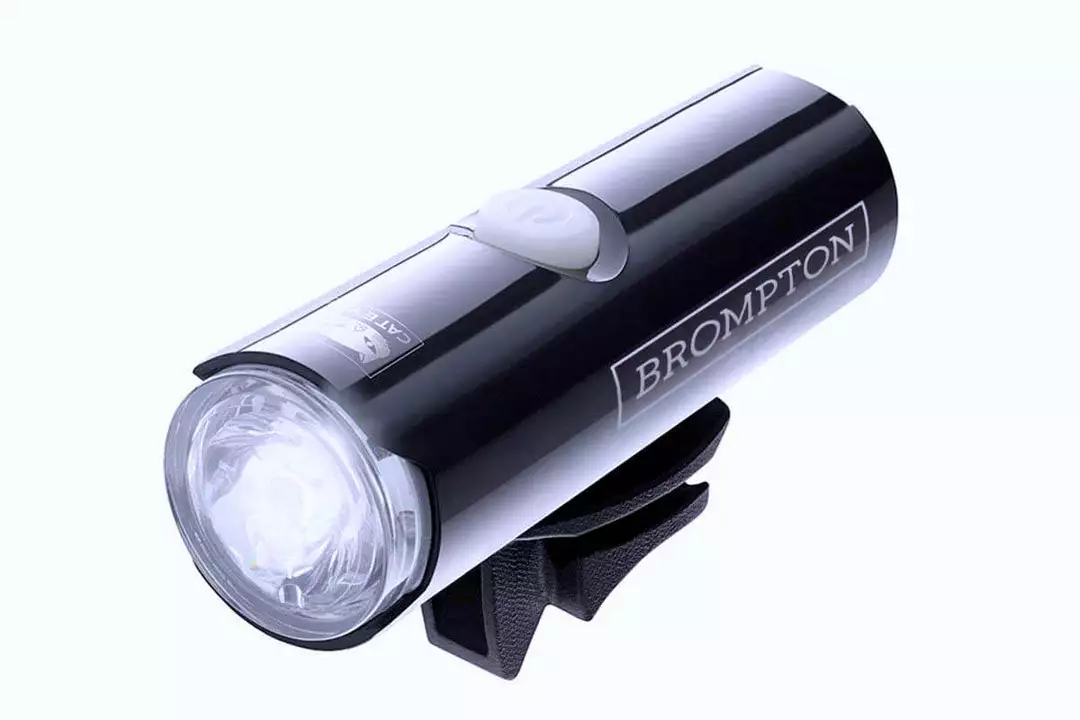 An all-new new rechargeable front light from Brompton, the CatEye Volt400 offers a 400 lumen output and neat mounting to the front fork with the included bracket. It’s compact and lightweight, USB rechargeable, and features a round beam pattern with OptiCube lens technology and 5 light modes.