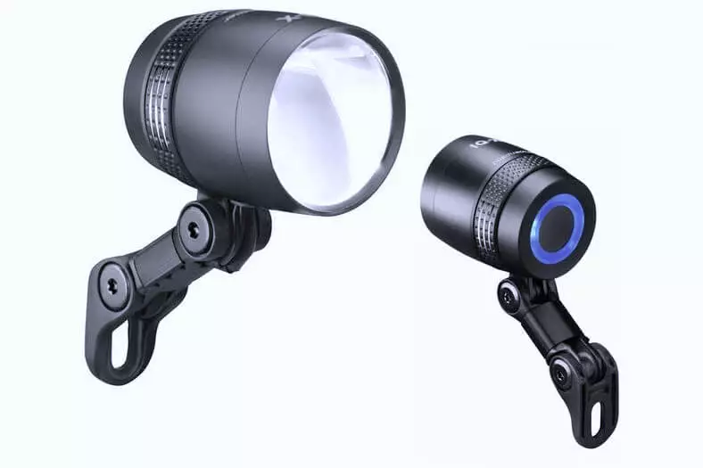 The IQ-X is Busch & Muller’s first dynamo light with an anodised aluminium housing. The 100 Lux light has an extremely wide light coverage with exceptional homogenous quality and depth which includes light at close range. The IQ-X incorporates the daytime running light option and additional LEDs that shine laterally. The rear On/Off button shines blue. It also has a light/dark sensor and standlight function. Busch & Muller have designed a special multi jointed mounting bracket with integrated cable conduit for fork mounting. It has a screw on front reflector.
