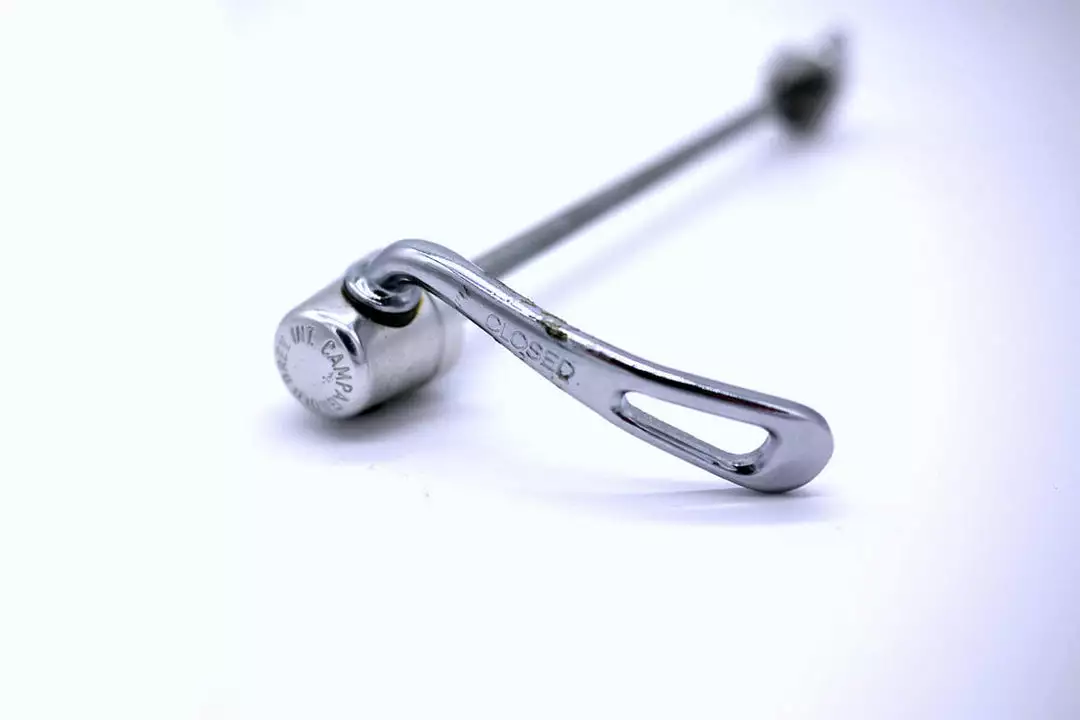 Original Campagnolo Record skewer with classic styling from the 1990s and early 2000 groupsets. The Campagnolo Record skewer features the unique cut out lever and looped bar. This is the perfect skewer for retro Campagnolo builds.