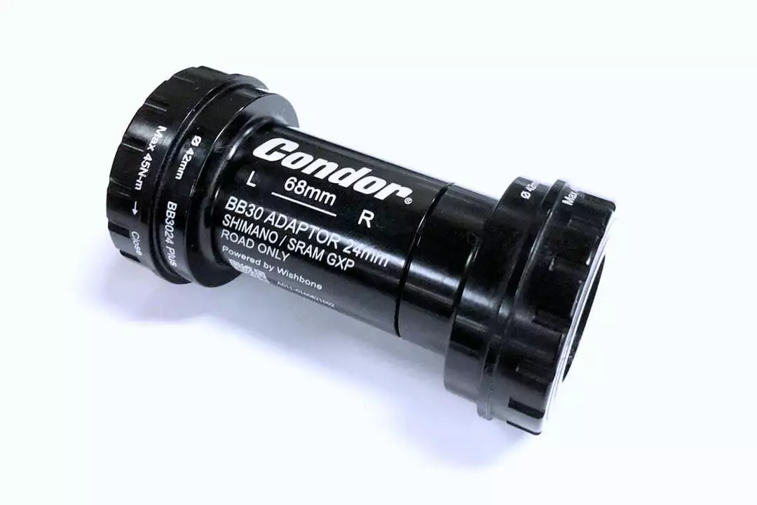 Avoid the creaking that is common with BB30 using the Condor BB30 System. The cups on each side of the frame thread into one another with an axle. This creates a tight and precise fit in the frame, preventing the bearings from coming out of alignment and stops play in the bottom bracket.