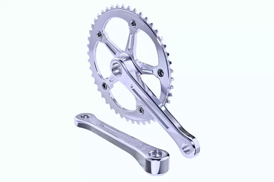 A single speed alloy chainset with fluted cranks in the old ‘Campag’ style.