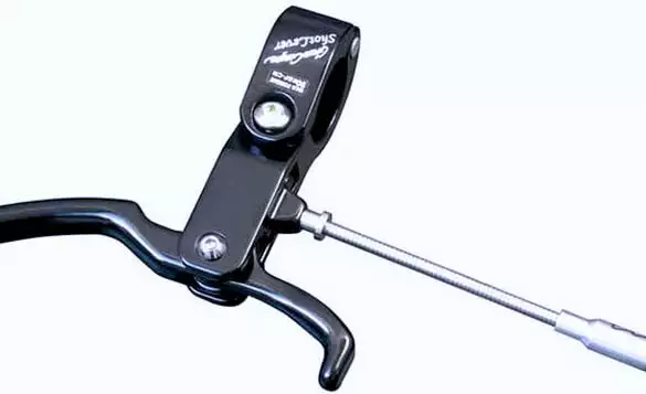 The bar-top-mounted Gran Compe Shot brake lever has two levers so can be used with either hand (especially useful when signalling). The larger lever on the right pushes the brake cable outer, the mini lever on the left pulls the inner cable; both actions have the effect of applying the brake. The clamp size is 25.4mm, but can reduce to 22.2mm with shims included in the box.