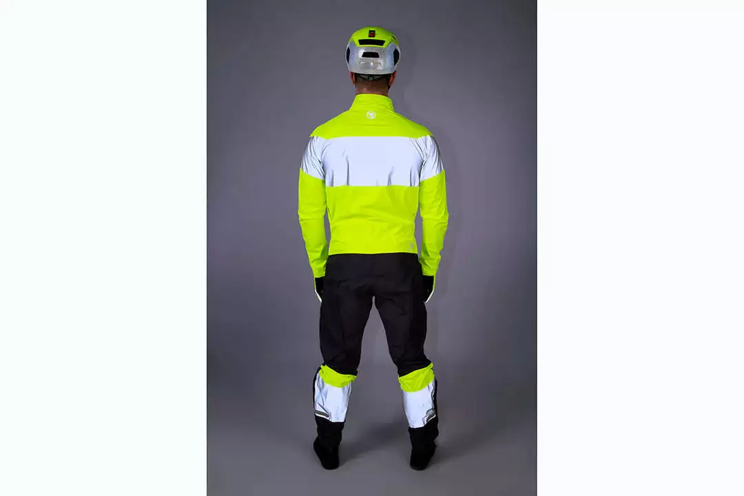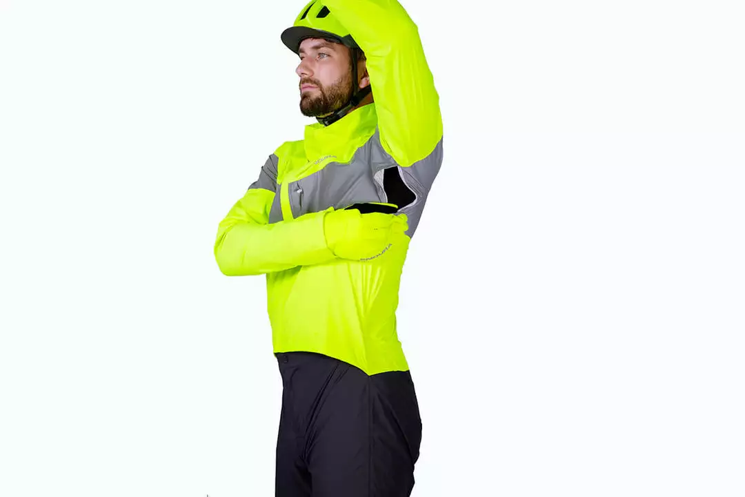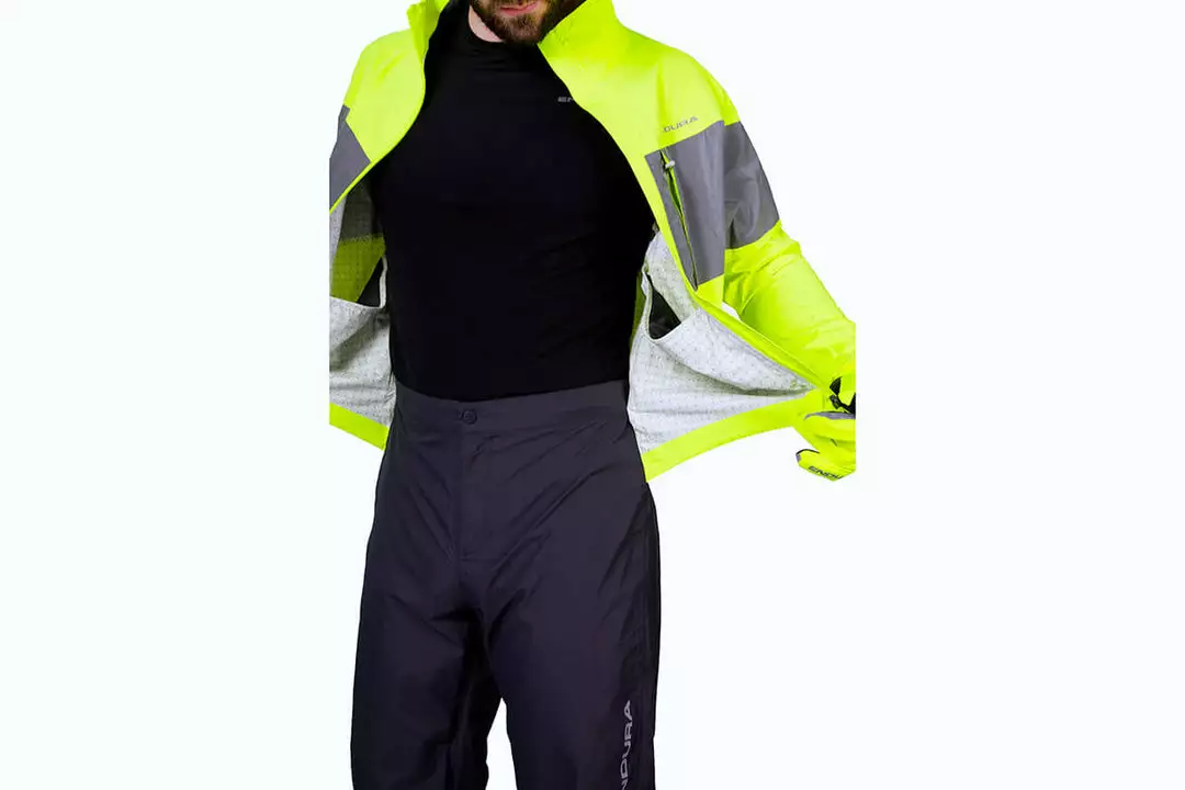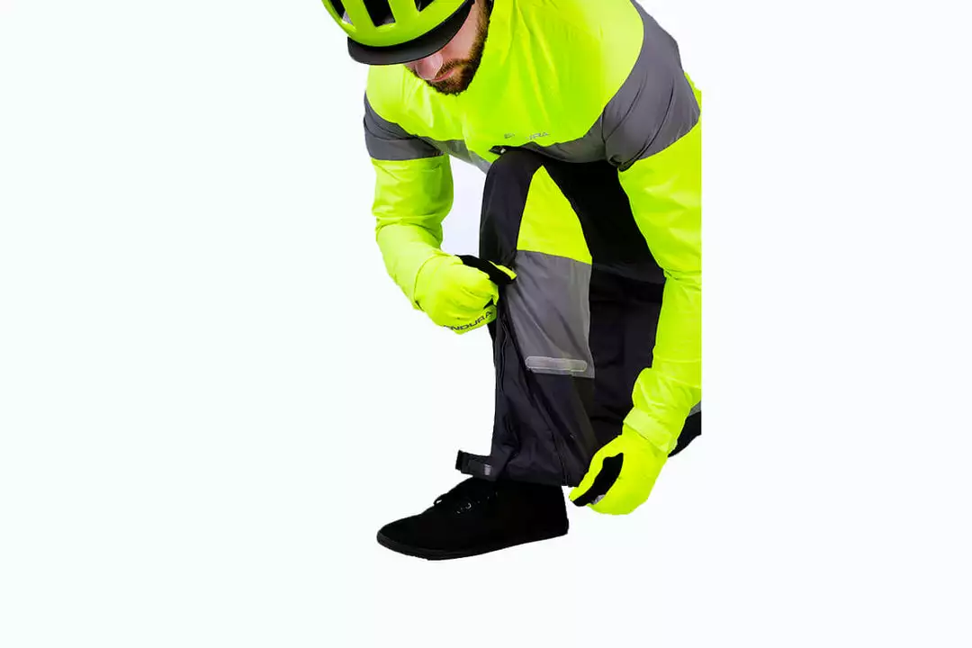 Endura exclusive split front design for maximum spray protection and comfortable on bike fit .