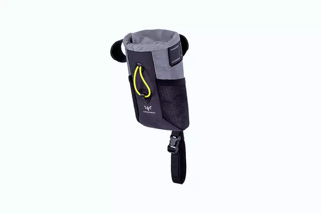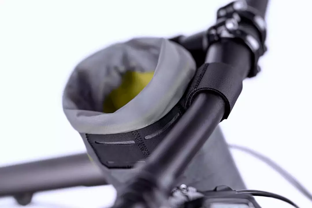 Contents are held in place by a simple bungee cord closure that can be tightened with one hand, and its nylon straps can be attached to various sides of the pouch, making it suitable for many different combinations of handlebars and stems.