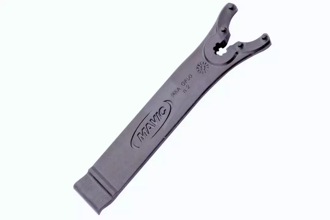 Mavic’s Tyre levers are made from robust hard plastic with the following functions: spoke fixing for bladed spokes, nipple tool for Mavic special nipples (for Mavic wheels R-SYS, R-SYS SLR, Ksyrium SR, SL and Elite from 2011), bearing adjustment tool for Mavic QRM+ industrial bearing system.