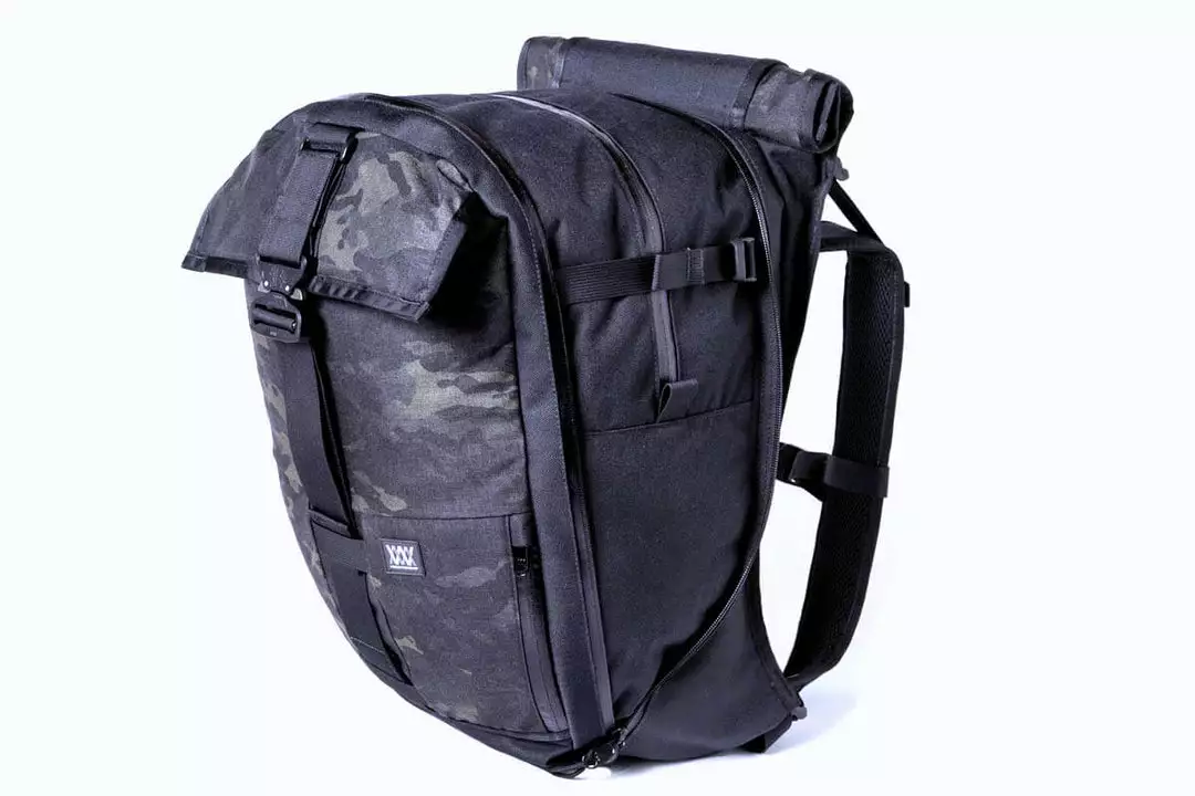 Mission Workshops cargo packs feature a water-resistant main compartment which can be used in either “roll-top” mode, or in the traditional “flap-down” configuration. These expandable backpacks have the ability to quickly double in size, allowing extra cargo capacity when needed.
