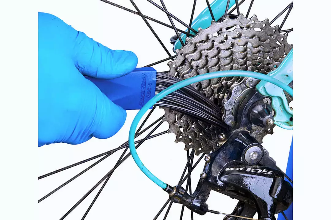 The long, stiff bristles of the GSC-3 are narrow enough to reach between the gears of tightly-spaced modern cassettes, while the slim contoured end is capable of picking grit and grime out of tight spaces such as derailleur pulley wheels.