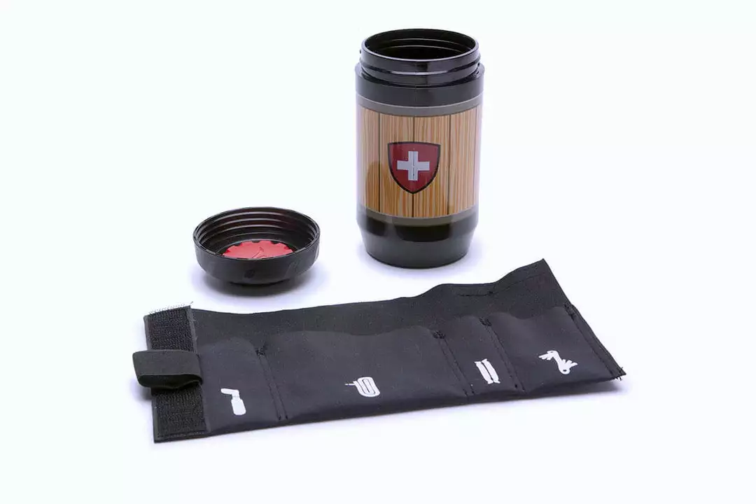 The barrel is a storage bottle (case) and includes a tool roll that you can fill at your discretion. There is enough space to fit two tyre lever, CO2 inflator and two cartridges.
