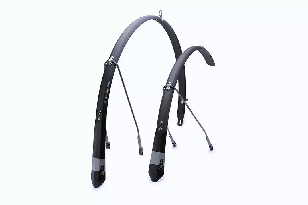 Made of anodized aluminum and adorned with laser graphics and an embossed alloy head badge, the Full Metal Fenders are a beautiful complement to any bike. They provide full-wrap coverage, even shielding your shoes and riders on your rear wheel thanks to sturdy rubber mudflaps. Safety release tabs ensure your wheels keep turning even if debris gets lodged between the fender and tyre.