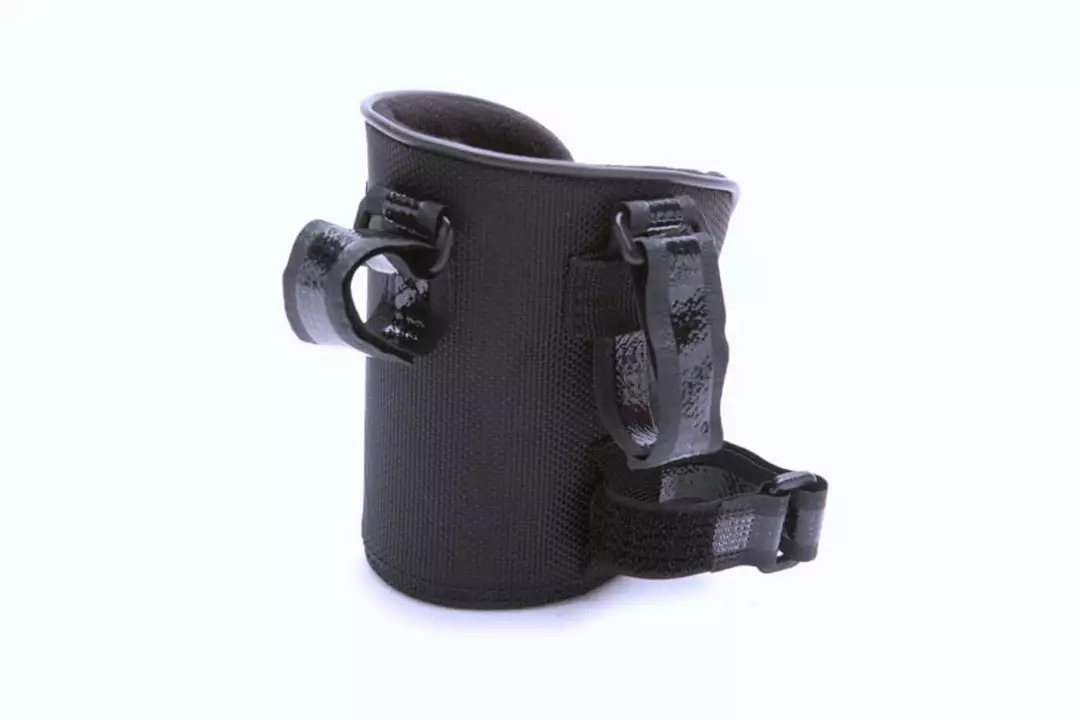 Meticulously constructed of three layers for maximum functionality. The inner layer embraces your beverage with a soft microfiber that won’t scratch your container. The outer layer is crafted of a bombproof nylon for long lasting durability, with an elastic band that allows for varying bottle sizes. In between these two layers is a firm but flexible plastic liner that provides rigidity, meaning your Hot Take will never lose its shape. Three points of attachment fasten to your stem, handlebars, and steerer tube for a firm hold, providing carefree riding and sipping.