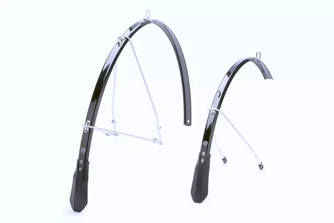 The 700×30 Poncho Fenders will fit close clearance road bikes with 700×23 tires maximum or road bikes designed to take fenders with up to 700×25 tires. They are designed to fit under caliper brakes and forks, and include add-on mounts for bikes that lack eyelets.