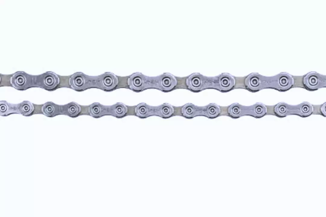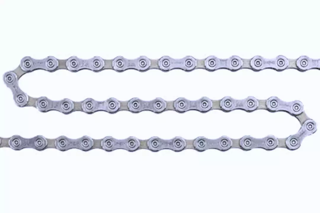 Outer plate design has been developed to reduce the chance of chain suck. The inner plate has been developed for better contact with gears providing smoother shifting under high load, giving efficient pedalling, increased rigidity and near silent running. Durability is assured through a chromising treatment on link pins, and the heat treatment of rollers, pins, and plates.