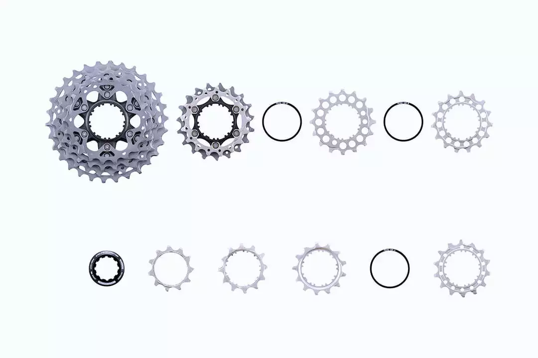 Made from a lightweight alloy and carbon fibre spider that houses alloy sprockets and titanium sprockets. The largest sprockets are manufactured from titanium to keep the weight low. The sprockets are also extensively cut away and drilled to further reduce weight without reducing rigidity.
