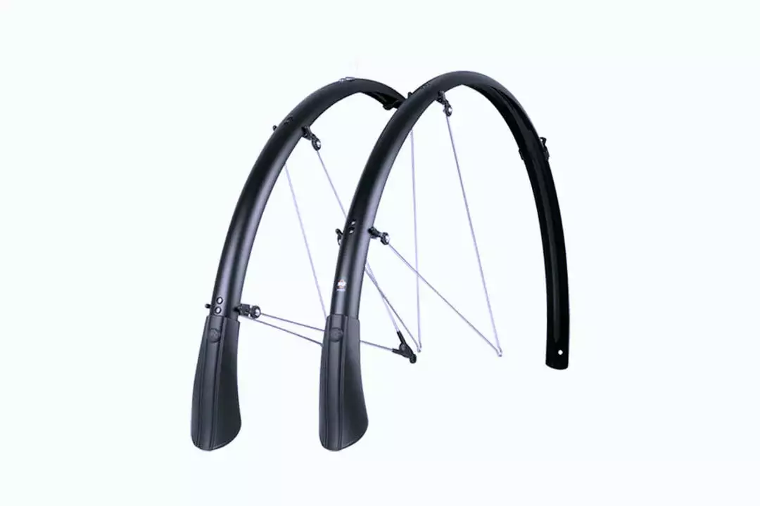 The mudguards are robust and rigid. Fenders feature a sandwich design with superfine aluminium strips embedded in plastic sheathing. The ASR safety release system releases stays should branches become trapped between the mudguard and the front wheel. Includes a struts kit, a stainless steel fixed bridge and mounting materials. Made in Germany.