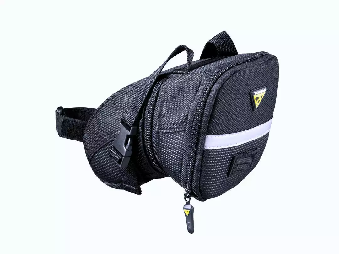 The Topeak Areo Wedge Pack Small is an aerodynamic seat bag holds tubes, tools and other repair items. Mounts with our innovative Quick Release Buckle system to fit all railed saddles. Four sizes offered to exactly fit rider’s needs.